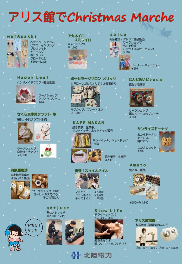 2025年12月7日(日) 、志賀町アリス館志賀にて「アリス館でChristmas Marche2025」が開催されます。
