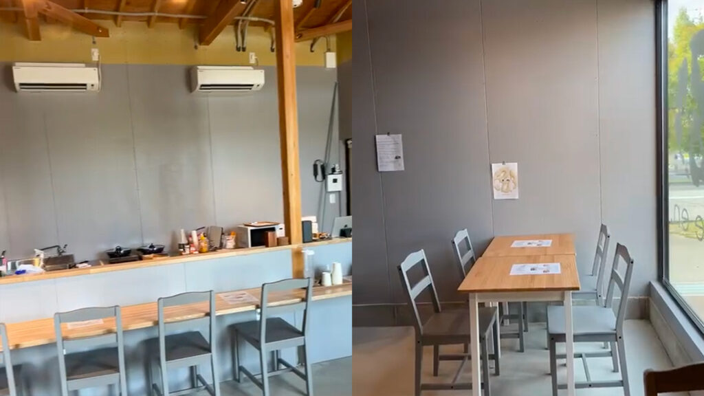 店内はグレーで統一された壁や椅子が、木目調のテーブルをより際立たせる落ち着いた空間。