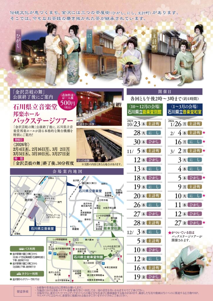 「金沢芸妓の舞」の全体スケジュールは公式サイト・チラシよりご確認ください。