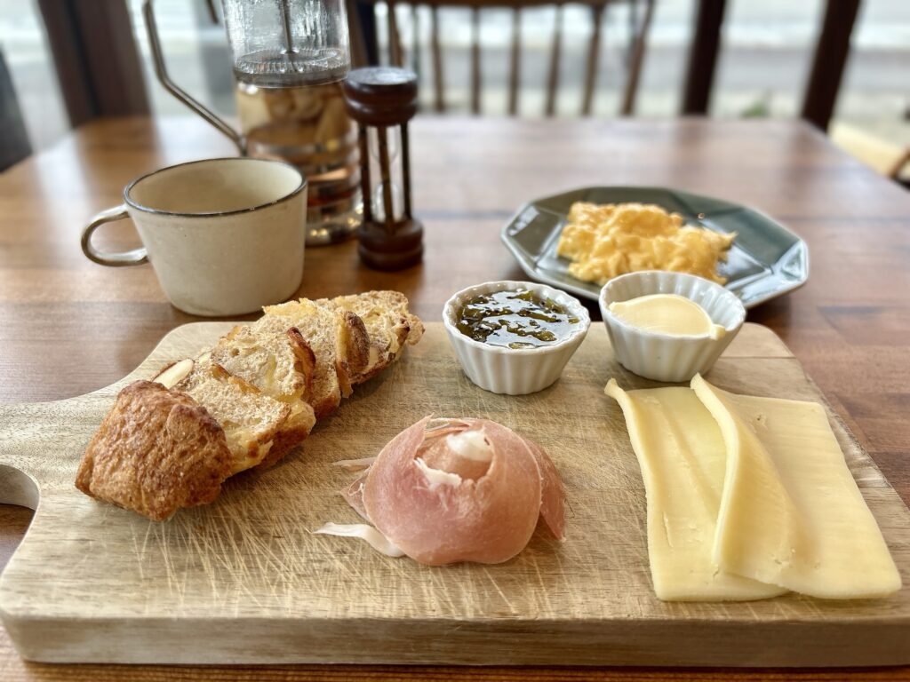 好きなパンとドリンクを選んだら、そこへ生ハムやチーズ、さらに自家製ジャムが添えられた、シンプルながらも満足感たっぷりの一皿が登場。