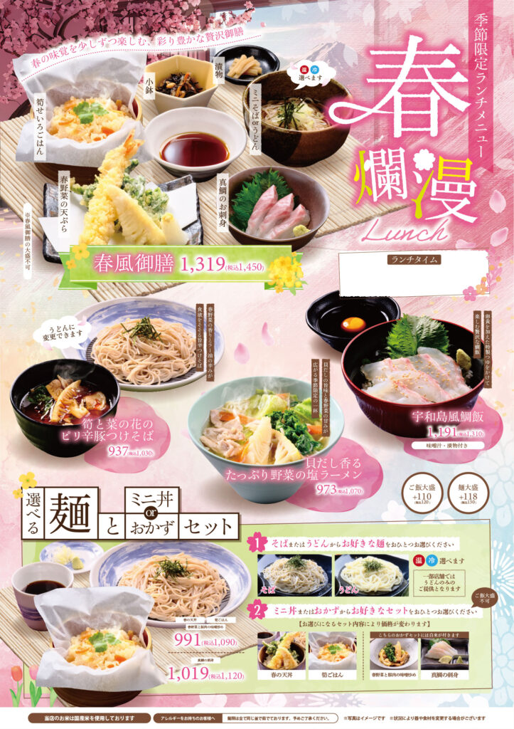 | 内容 | 筍せいろごはんや春野菜の天ぷらがついた春風御膳、筍と菜の花のピリ辛豚つけそばなど、旬の食材を使ったお料理 |
