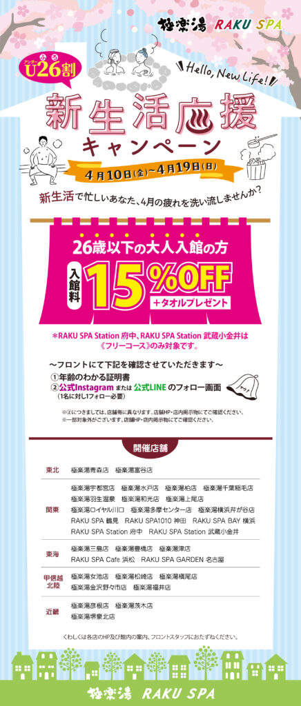 | 内容 | 対象:26歳以下の大人入館の方 入館料15%OFF+タオルプレゼント ※フロントにて下記を確認させていただきます ①年齢のわかる証明書 ②公式Instagramまたは公式LINEのフォロー画面 (1名に対し1フォロー必須) |