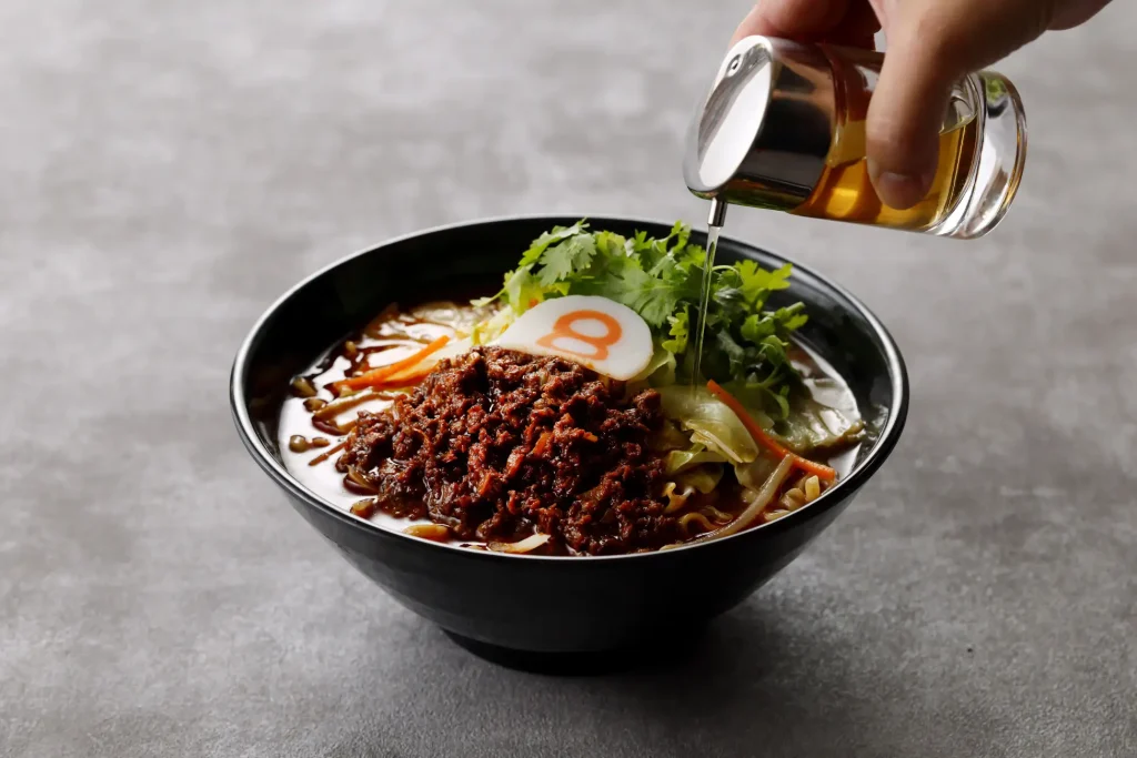お好みで「8番酢」をひと回しすると、味わいに奥行きが生まれ、後を引く美味しさに変化します。さらにトッピングとして「パクチー増し」も!追いパクチーで爽やかさと華やかさがプラスされ、奥深い辛さの中にもすっきりとした香りのアクセントを楽しむことができます♩
