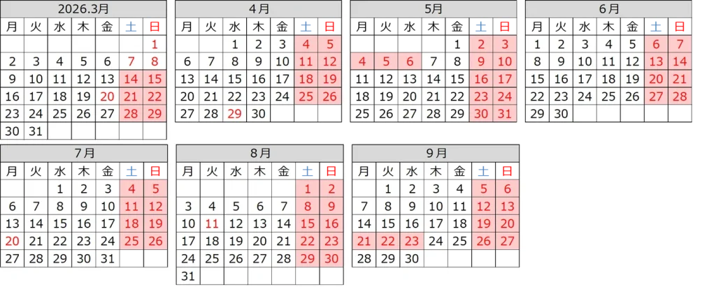 ・3月14日(土)以降、土曜日・日曜日および5月のGW・9月のSWの祝日