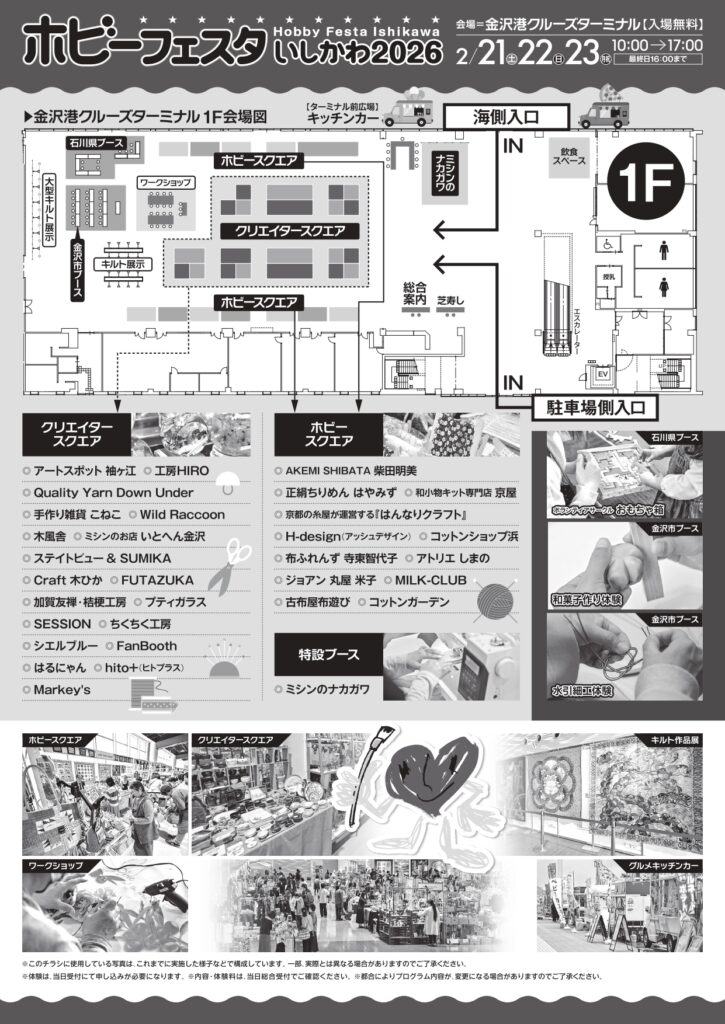 キルト作品約300点の展示や、クリエイタースクエア・ホビースクエア・特設ブース・石川県ブース・金沢市ブースの各コーナーでは販売・展示・体験など盛りだくさんな内容です♪キッチンカーの出店予定されています♪