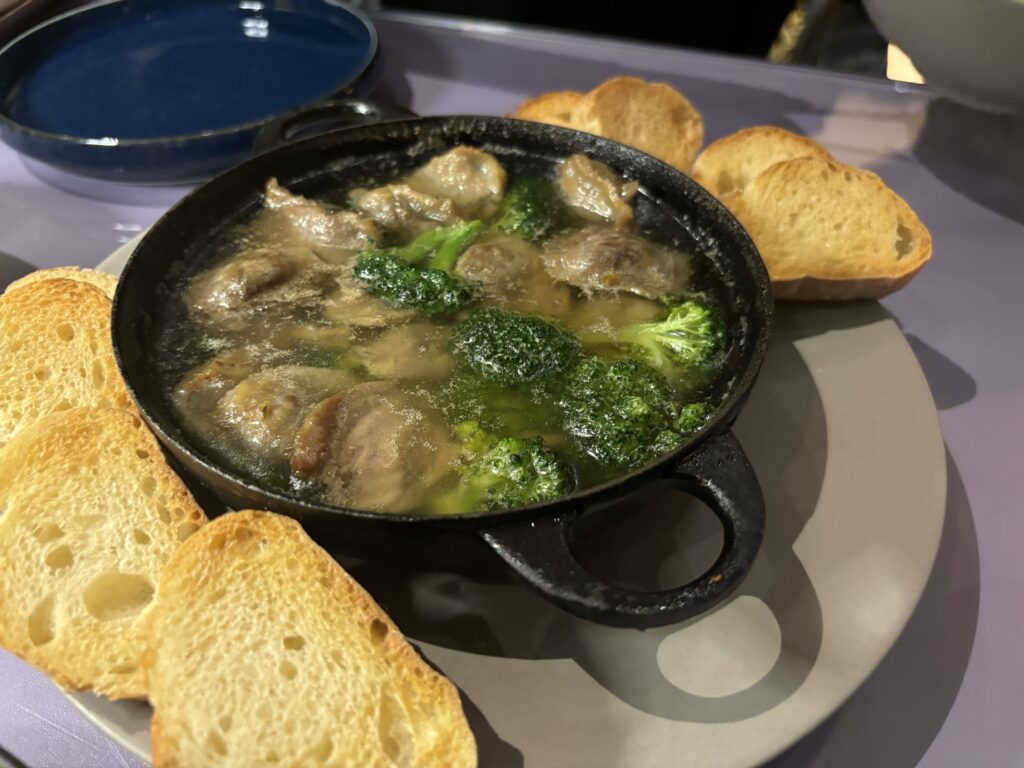 砂肝とブロッコリーのアヒージョ バケットは、やわらかい砂肝とブロッコリーにオイルがしっかり絡んでいておつまみに最高…!