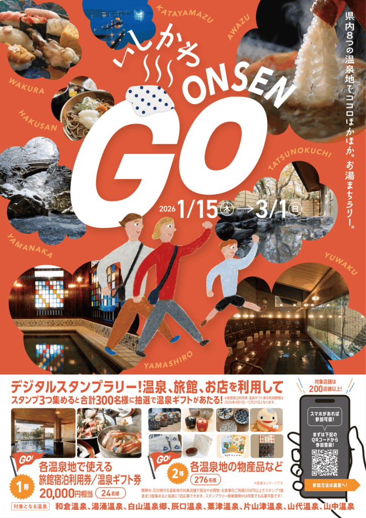 1月15日(木)~3月1日(日)の期間中、石川県内8つの温泉地にて「いしかわ ONSEN GO!デジタルスタンプラリー」が開催されています。対象となる温泉は、「和倉温泉」「湯涌温泉」「白山温泉郷」「辰口温泉」「粟津温泉」「片山津温泉」「山代温泉」「山中温泉」です。