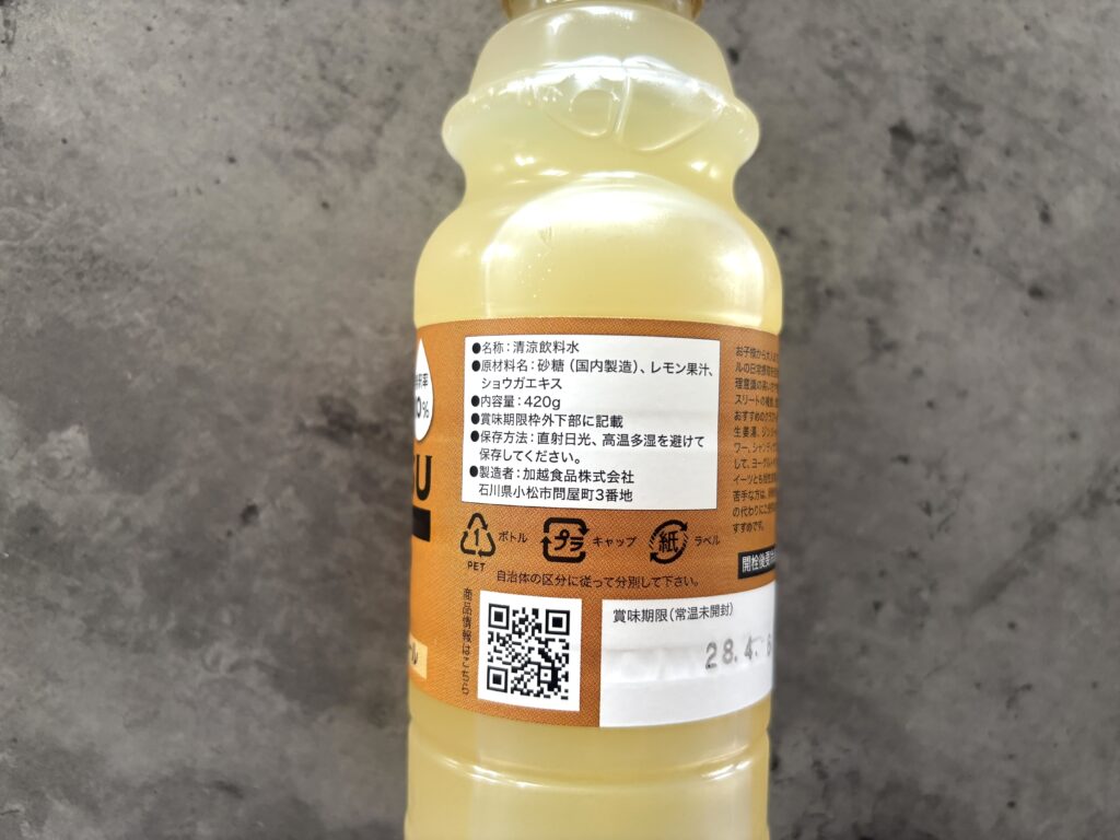 原材料は「砂糖(国内製造)、レモン果汁、ショウガエキス」のみというシンプルさ。