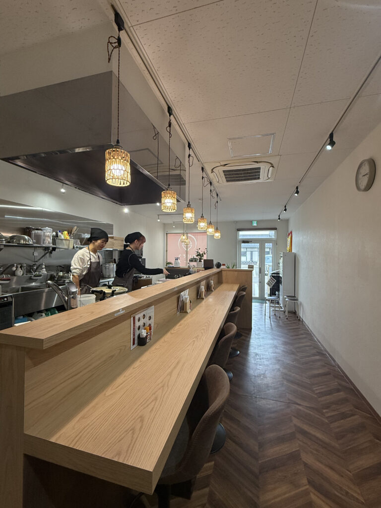 白と木目を基調としたナチュラルな店内。こだわりのおにぎりやスープでほっと一息。