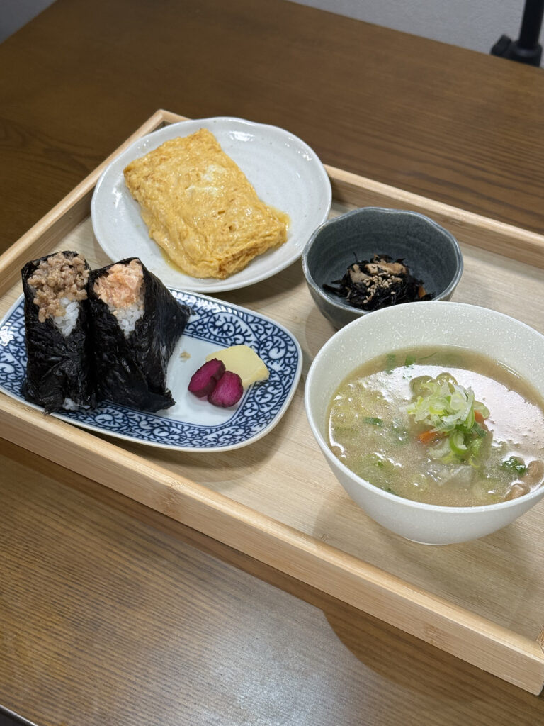 (おにぎり2個、スープ、小鉢、卵焼きのセット)