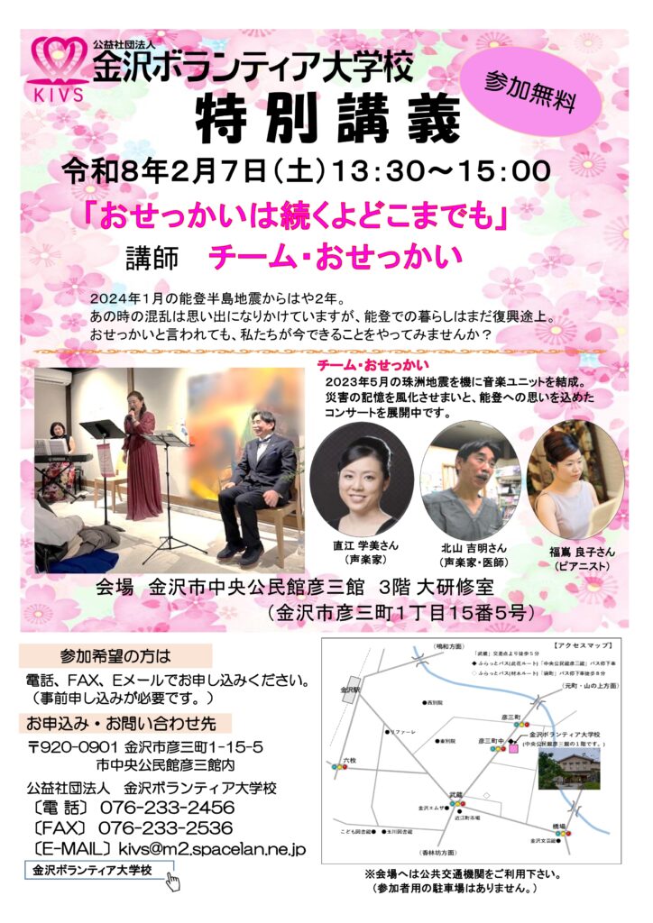 2月7日(土)、金沢市中央公民館彦三館にて『金沢ボランティア大学校特別講義「おせっかいは続くよどこまでも」』が開催されます!