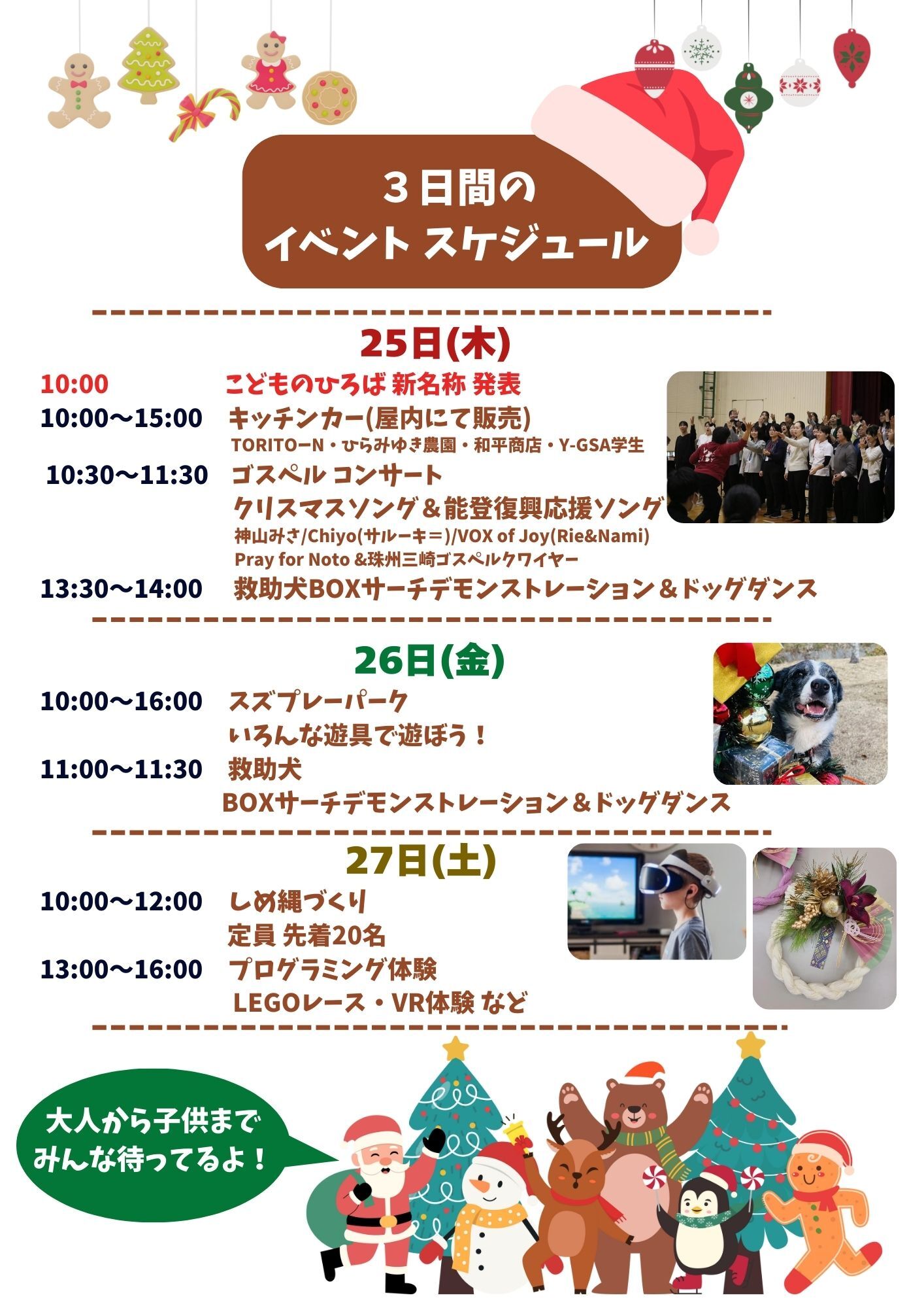 | 内容・特記事項 | 12月25日(木) 10:00 こどものひろば 新名称 発表 10:00~15:00 キッチンカー(屋内にて販売) 10:30~11:30 ゴスペルコンサート クリスマスソング&能登復興応援ソング 13:30~14:00 救助犬BOXサーチデモンストレーション&ドッグダンス 12月26日(金) 10:00~16:00 スズプレーパーク いろんな遊具で遊ぼう! 11:00~11:30 救助犬BOXサーチデモンストレーション&ドッグダンス 12月27日(土) 10:00~12:00 しめ縄づくり 定員 先着20名 13:00~16:00 プログラミング体験 LEGOレース・VR体験など |