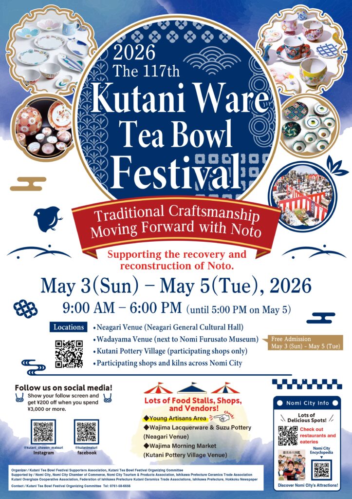 | 内容・特記事項 | 🍽️飲食・物販・屋台が多数出店! 九谷焼はもちろん、人気の飲食店/キッチンカーが勢揃い! * !NEW! 若手の作り手エリア(根上会場) ←注目 * 輪島塗・珠洲焼の出店(根上会場) * 輪島朝市も出店!(九谷陶芸村会場) 🎨【九谷陶芸村】イベント盛りだくさん! (5/3-5/5) * KAM 能美市九谷焼美術館 * 五彩館: 第49回伝統九谷焼工芸展 : 期間中、観覧料無料! * 浅蔵五十吉記念館: 五十吉深香陶釜展:期間中、観覧料無料! * 体験会:伝統の登り窯「能美窯」の焼成、絵付・作陶体験 * 職人工房: 職人工房市 * 自立支援工房「ギャラリー彩」共同工房利用者展 * 石川県立九谷焼技術研修所: 令和7年度 卒業制作展・1日開放 |
