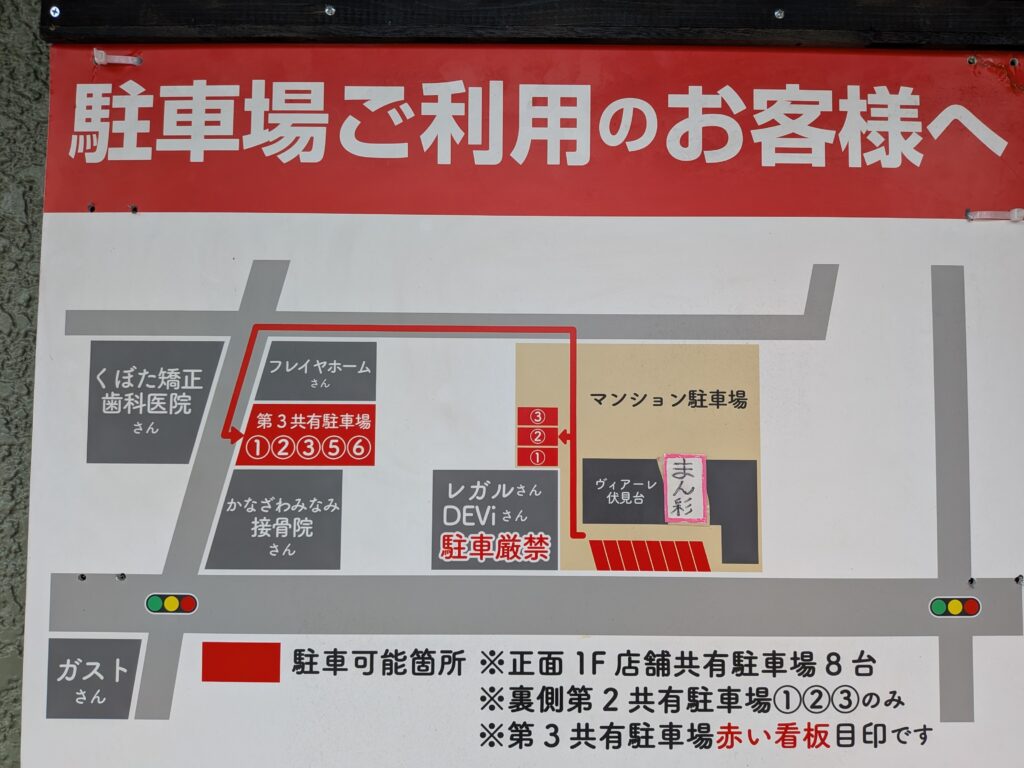 駐車場は店前の共有駐車場が8台、店横に3台、第3駐車場に5台分用意されているので、お車での来店も安心です。