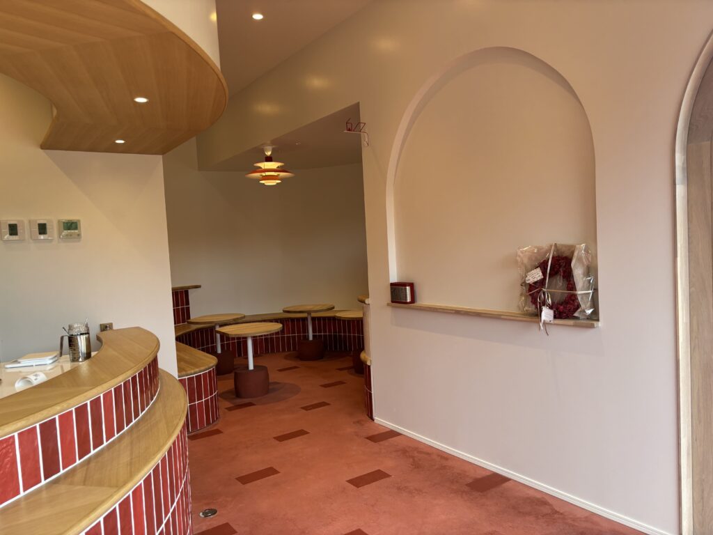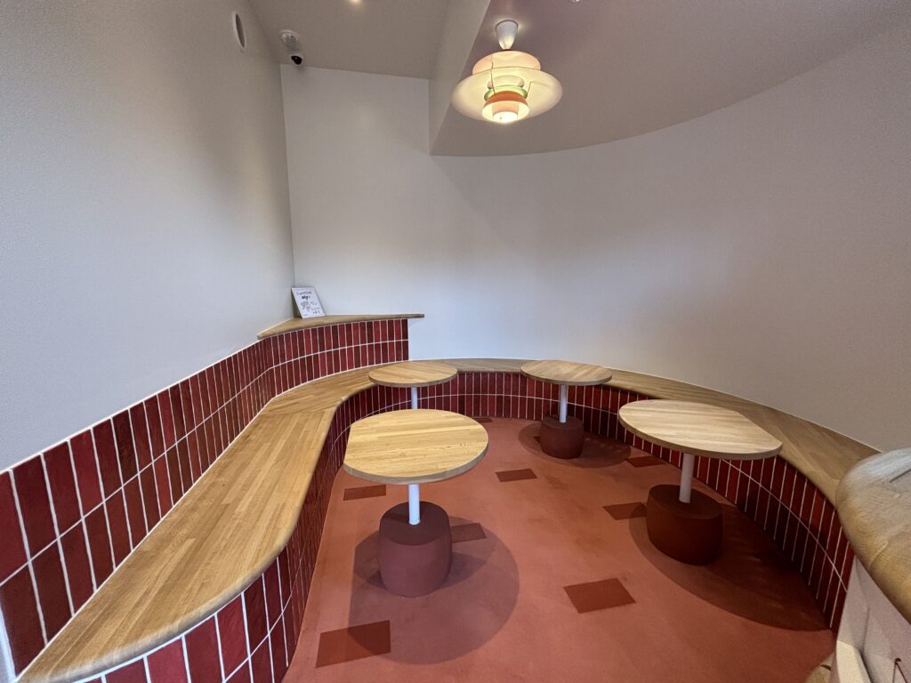 赤と白、木目を基調としたかわいらしいイートインスペースも用意されています。