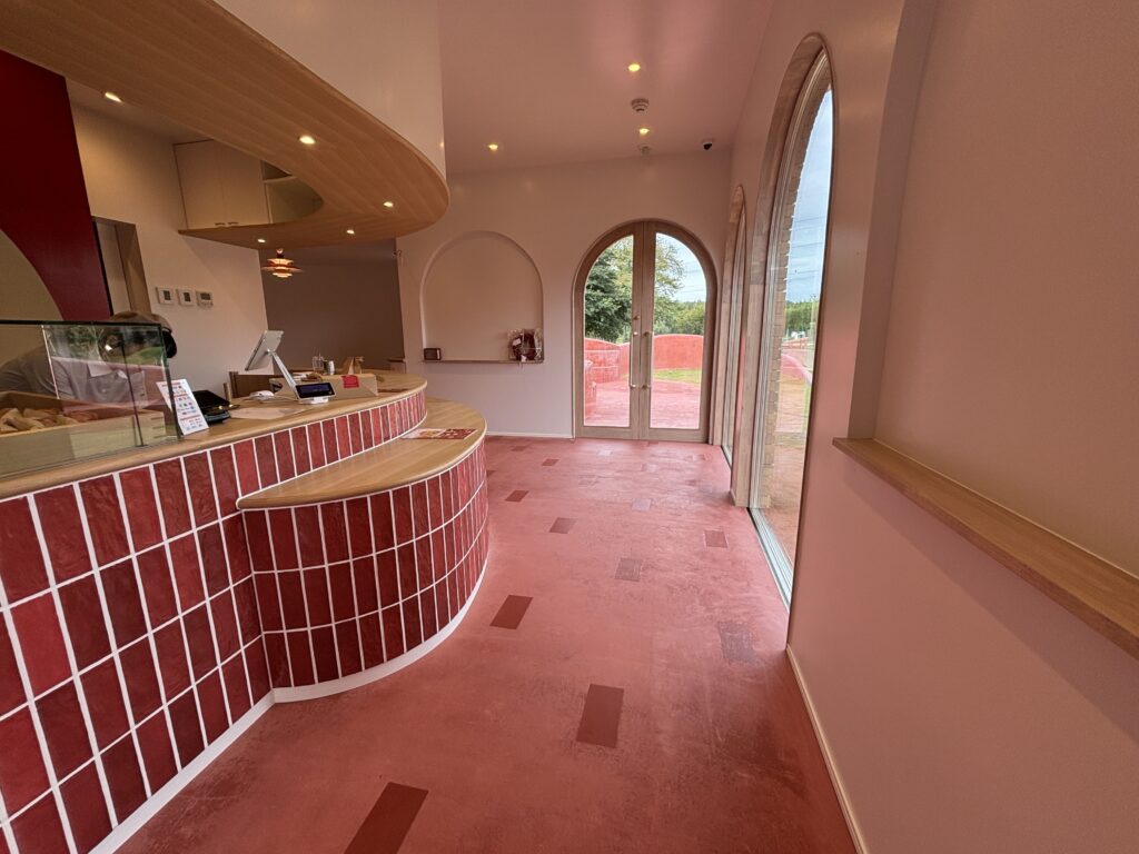 真っ赤な屋根とレンガ調の壁が印象的で、遠くからでもすぐに見つけられます。