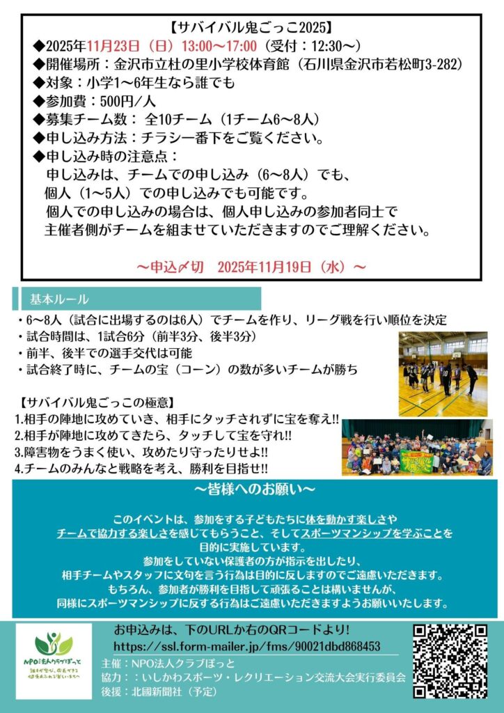 11/23(日)、金沢市立杜の里小学校 体育館にて「サバイバル鬼ごっこ2025」が開催されます!