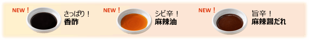 追加すると“さっぱり”味変の香酢と“シビ辛”に味変ができる麻辣油(マーラーユ)・麻辣醤(マーラージャン)だれで、お好みの味に調整可能◎