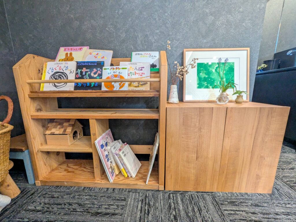 子どもの絵本やちょっとしたおもちゃがおかれたコーナーがあり、子ども連れの来店も安心!