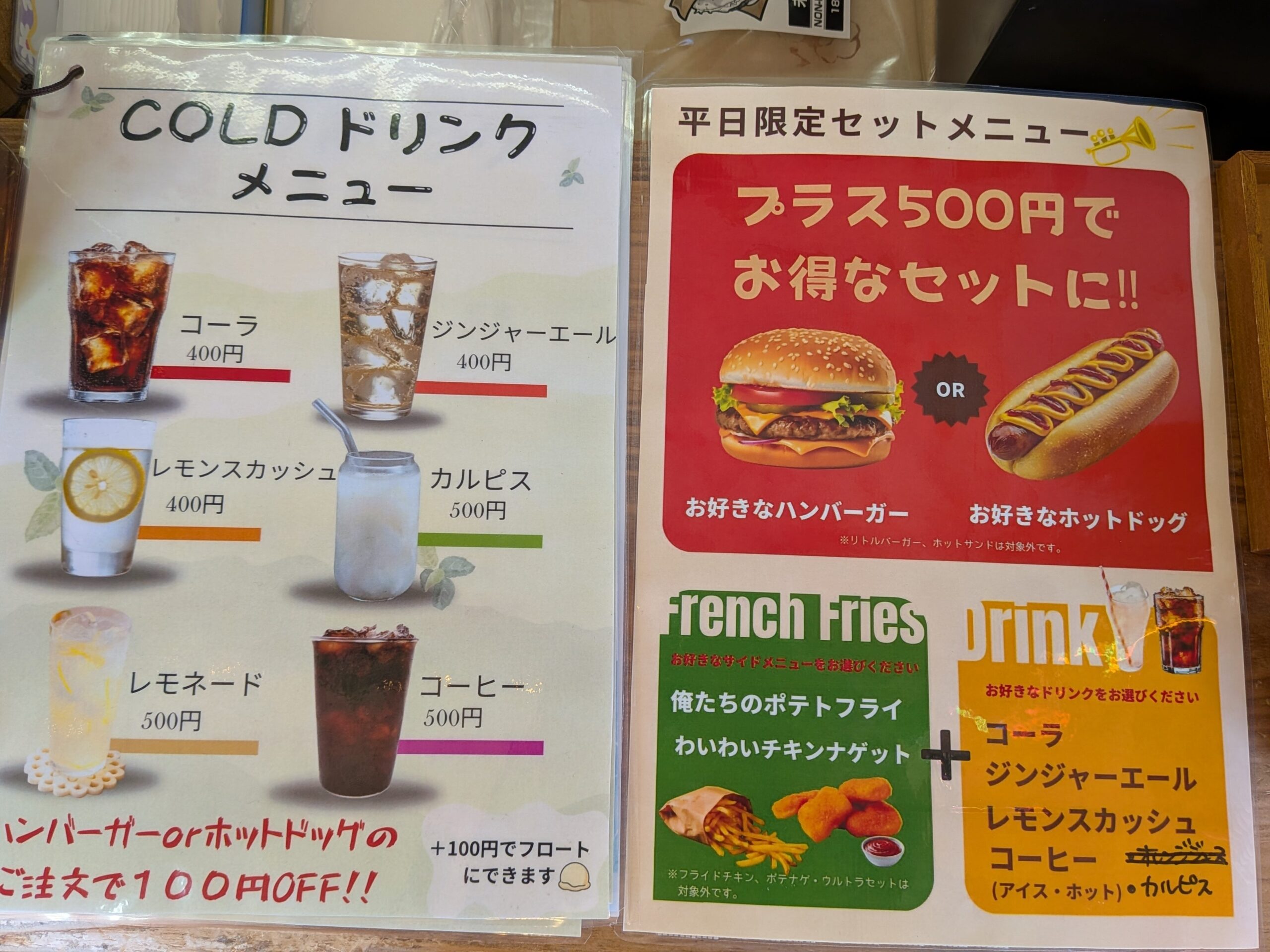 平日限定で「ポテトフライ」か「チキンナゲット」とドリンクのセットが500円になる嬉しいセットメニューもあります。
