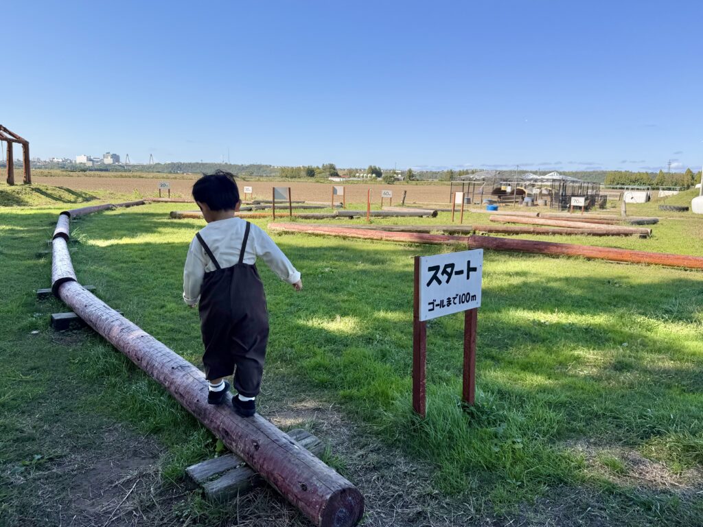 売店とウサギ小屋の間にある「丸太の一本橋」は、シンプルながらもスリルが楽しめる人気の遊具!