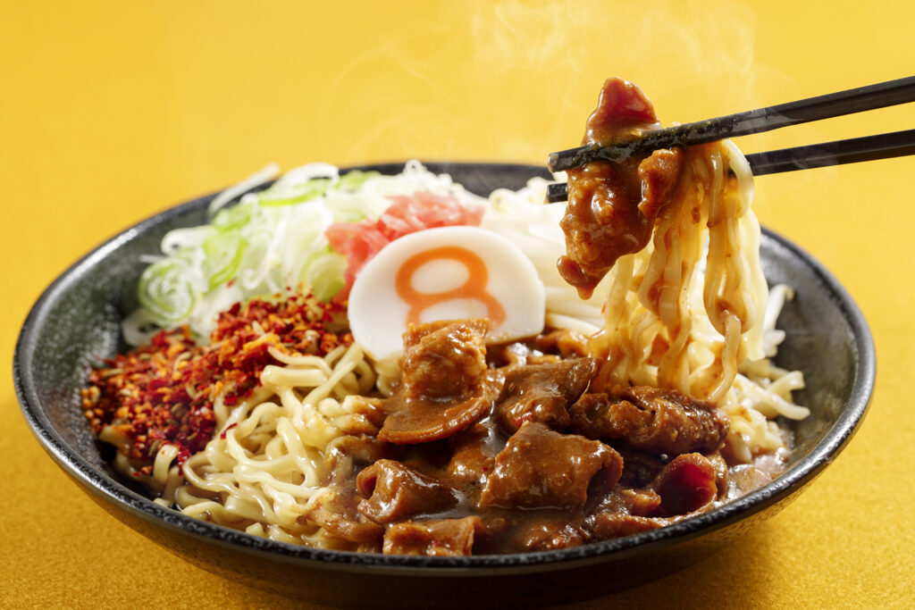 人気メニューの8番流まぜそば「唐麺」をベースに、特製味噌ダレでじっくり煮込んだ「牛もつ煮」をトッピング。