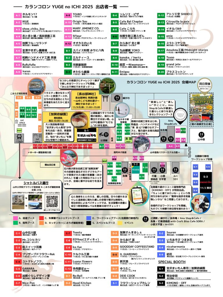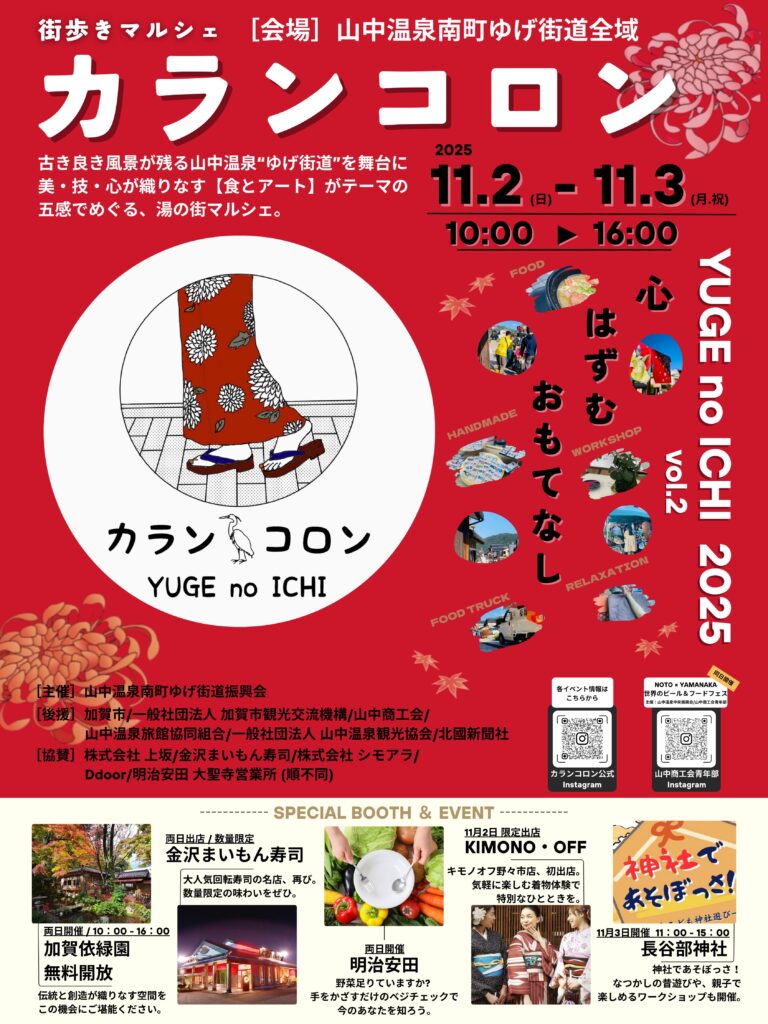内容・特記事項 | 山中温泉・南町ゆげ街道が、マルシェに変わる特別な2日間。 カランコロン YUGE no ICHIとは “カランコロン”と踊り歩きたくなるような、古き良き風景が残る「山中温泉・南町ゆげ街道」を会場に、”文化”をアートと捉えた湯の街マルシェ。 地域に息づく手しごと、食、癒し、そして人とのふれあい── 色とりどりのブースが、暮らしの中の“美・技・心”を表現し、アートのように彩ります。 秋の彩りに包まれながら、五感でめぐる“おもてなし”の2日間をお楽しみください。 ✨2日間約70ブース出店 スペシャルブースとして金沢まいもん寿司が出店や、KIMONO・OFF野々市店による着物レンタル体験、明治安田によるベジチェック(健康チェック)、神社遊びなど特別企画も多数。 同日開催として「NOTO × YAMANAKA 世界のビール&フードフェス」を別会場にて開催。 能登支援の限定フード&クラフトビールも楽しめます。 |