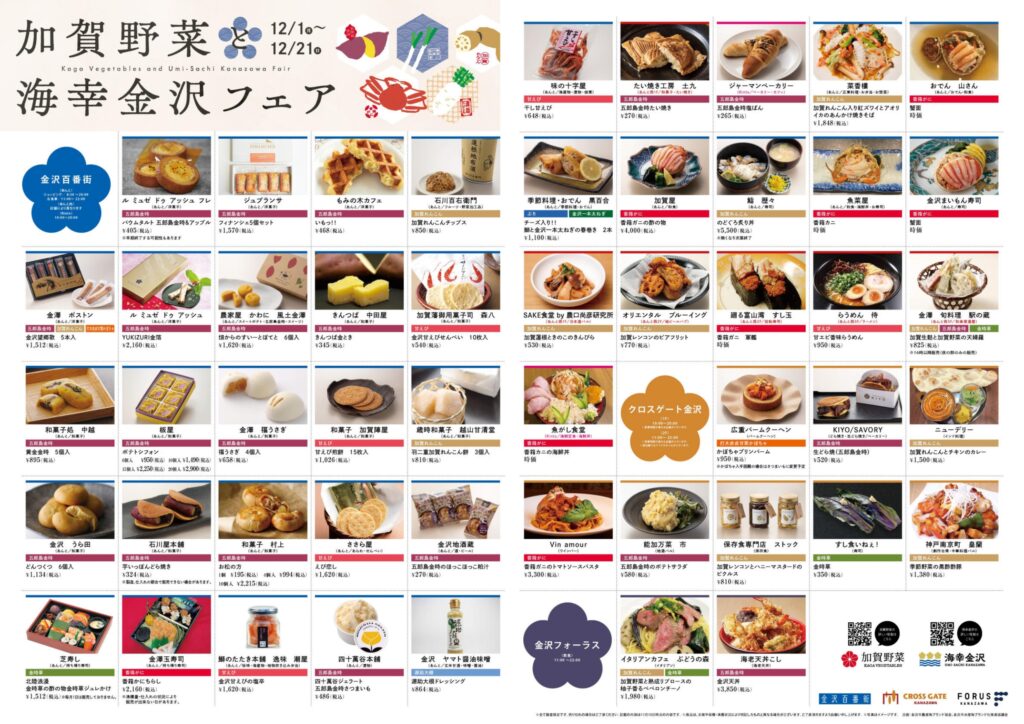 季節感あふれる個性豊かな15品目が認定されている加賀野菜や、金沢港で水揚げされた海の幸を使ったメニューや商品がフェア参加店舗(計 50店舗)で販売されます。