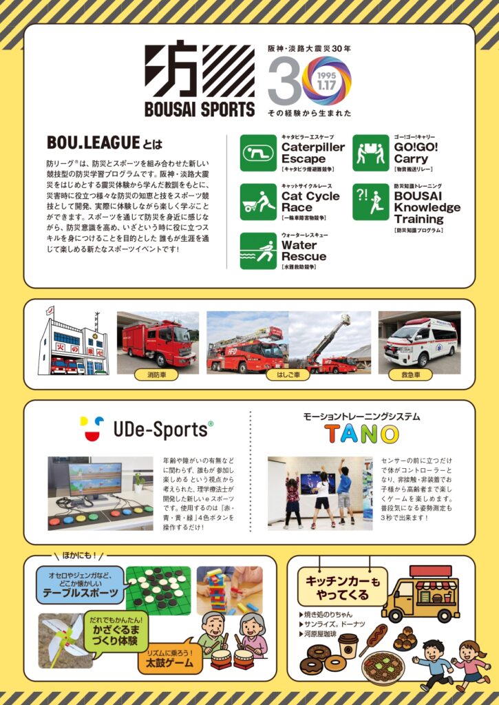 発災時に取るべき初動をスポーツに見立てて身体で覚える「防スポ」を始め、30m級はしご車のバスケット乗車体験や消防車放水体験、段ボール迷路、規格外野菜のレトルトカレー販売(志賀高校)、ロープワーク(国際医療専門学校七尾校)、酸素飽和度測定(七尾看護専門学校)、eスポーツやモーショントレーニング、昔遊び等、楽しく遊んで学べるコンテンツが盛りだくさんです。