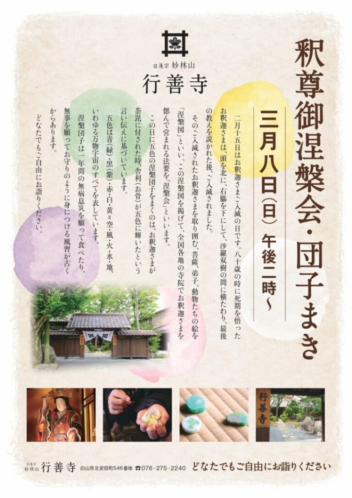 3月8日(日)、白山市の行善寺にて、「行善寺柿乃市・涅槃会」が開催されます。