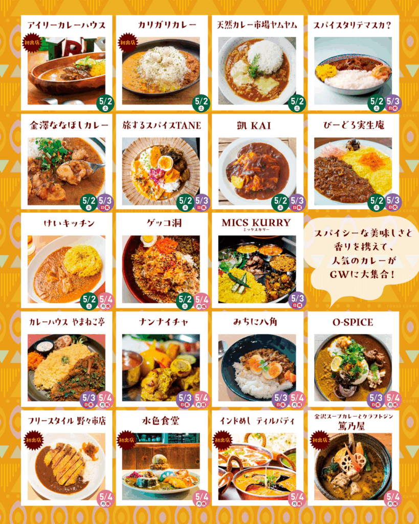 | 内容・特記事項 | 【入場料】 無料 【出店者】 🍛初出店✨ アイリーカレーハウス (5/2) @iriecurry2012 🍛初出店✨ カリガリカレー (5/2) @caligarikanazawa 🍛天然カレー市場ヤムヤム (5/2) @yumcurrystaff 🍛スパイスタリテマスカ? (5/2・5/3) @curryphilosophy 🍛金澤ななほしカレー (5/2・5/3) @nanahoshicurry.jp 🍛旅するスパイスTANE (5/2・5/3) @travelspice_tane 🍛凱 KAI (5/2・5/3) 🍛びーどろ実生庵 (5/2・5/3) @beadlo_misyouan 🍛けいキッチン (5/2・5/4) @kei_kitchen_kanazawa 🍛ゲッコ洞 (5/2・5/4) @geckostagram2025re_take 🍛MICS KURRY (5/3) @mics_kurry 🍛カレーハウス やまねこ亭 (5/3・5/4) @yamanekotei20230321 🍛タンドリーチキン専門店ナンナイチャ (5/3・5/4) @nannaicya 🍛みちに八角 (5/3・5/4) @michi_ni_hakkaku 🍛O-SPICE (5/3・5/4) @o_spice_massiverock 🍛初出店✨ フリースタイル野々市店 (5/4) @freestylenonoichiten 🍛初出店✨ 水色食堂 (5/4) @mizuirodays 🍛初出店✨ インドめし ティルパティ (5/4) @indomeshi_tirupati 🍛初出店✨ 金沢スープカレーとクラフトジン 篤乃屋 (5/4) @soupcurry_atsunoya |