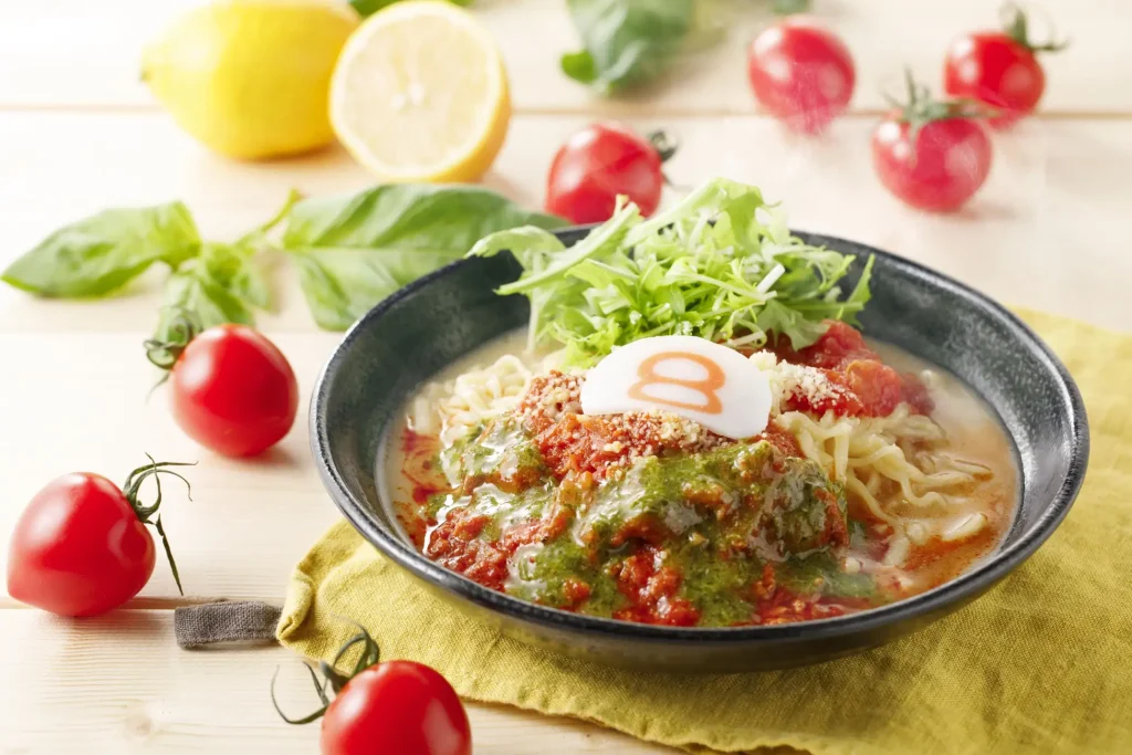 8番らーめんにて、福井県産のミディトマト「越のルビー」の“甘み”と“旨味”を活かした「野菜トマトらーめん」とオリジナルバジルソースをトッピングした「野菜バジルトマトらーめん」が3月2日(月)から、新商品の汁なしまぜそば「バジルトマト唐麺」が3月16日(月)から期間限定で発売されます。
