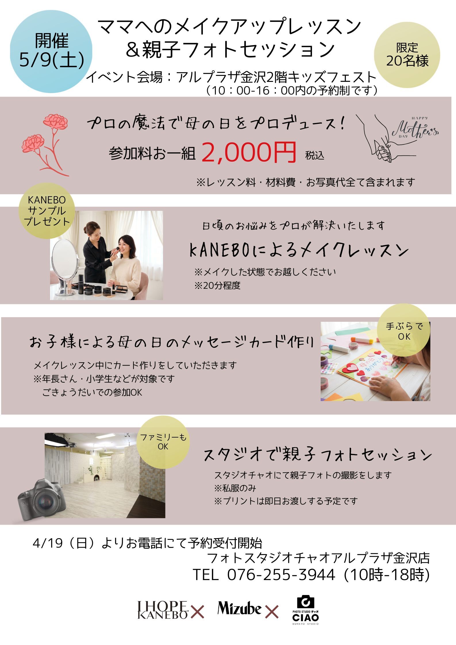 2026年5月9日(土)、アルプラザ金沢にて「ママへのメイクアップレッスン&親子フォトセッション」が開催されます。