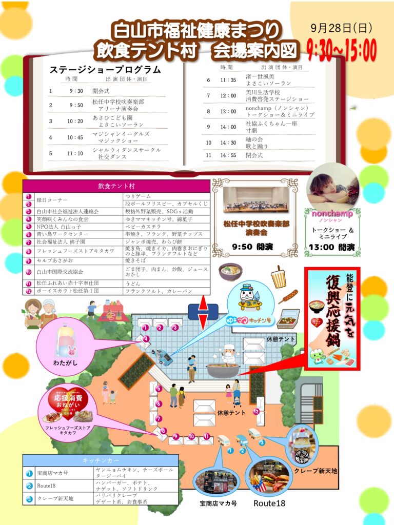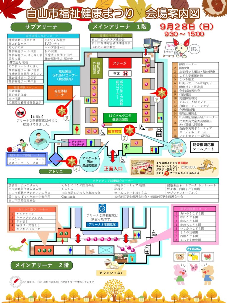 | 内容・特記事項 | 【内容】 (1)地域共生社会啓発ステージショー (2)福祉施設・ふれあいコーナー (3)ボランティア活動紹介コーナー (4)福祉体験コーナー (5)はくさんタニタ健康クラブコーナー (6)飲食テント村コーナー (7)わくわく遊びコーナー (8)トレジャーツアーコーナー など |