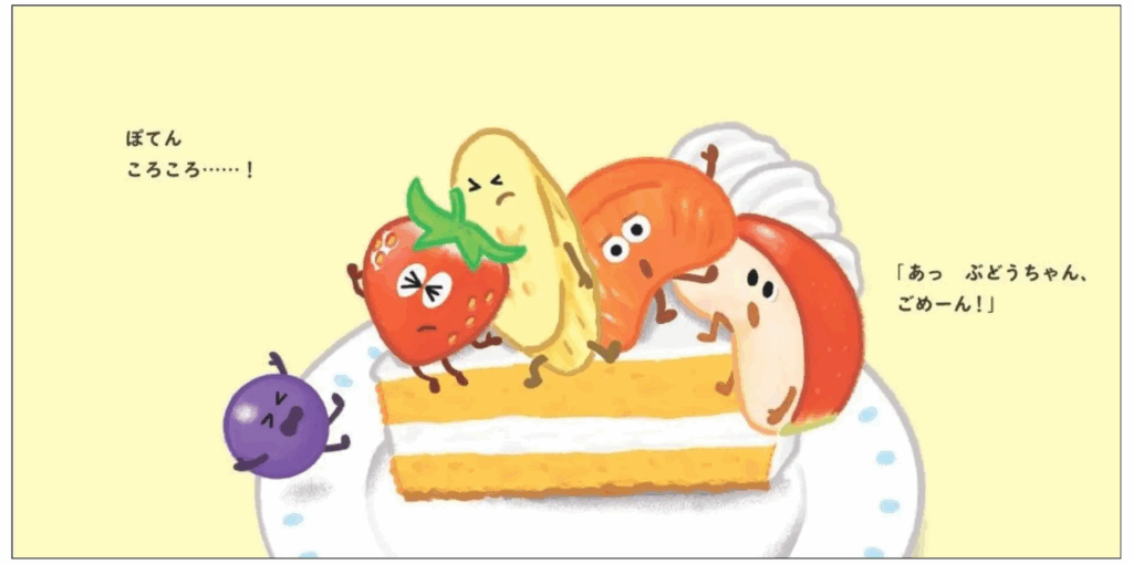 白いクリームのケーキの上に、ぶどうちゃんがちょこんと座っていると、いちごちゃんがやってきて「ぼくもいーれーて」