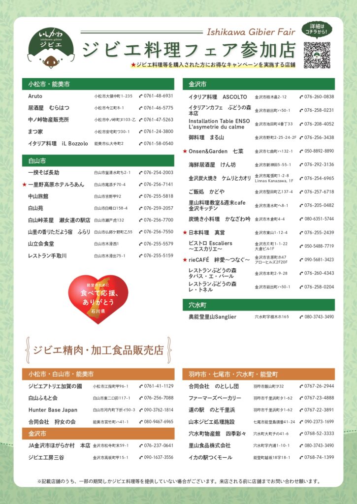 ※ジビエ料理をご注文、もしくはジビエ商品をご購入した際、店員に「いしかわジビエ料理フェアのチラシ・HP等を見た!」とお声かけください。