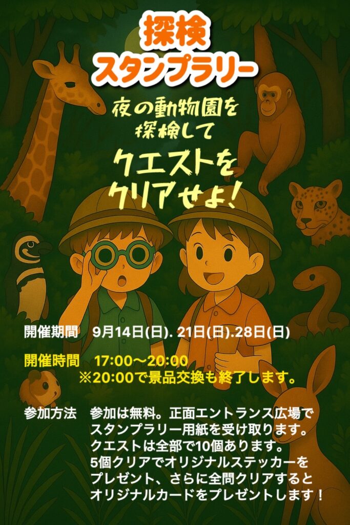 今年は「さぁ、夜の冒険へ出かけよう!」をキャッチコピーに、夕暮れ時の動物園にスポットを当てています。 そして、ナイトZOOとしては初めての探検スタンプラリーを開催♪また、人気の「ほね骨ナイトズー」や幻想的にライトアップされた動物たちの、飼育員によるナイトガイドを開催します。