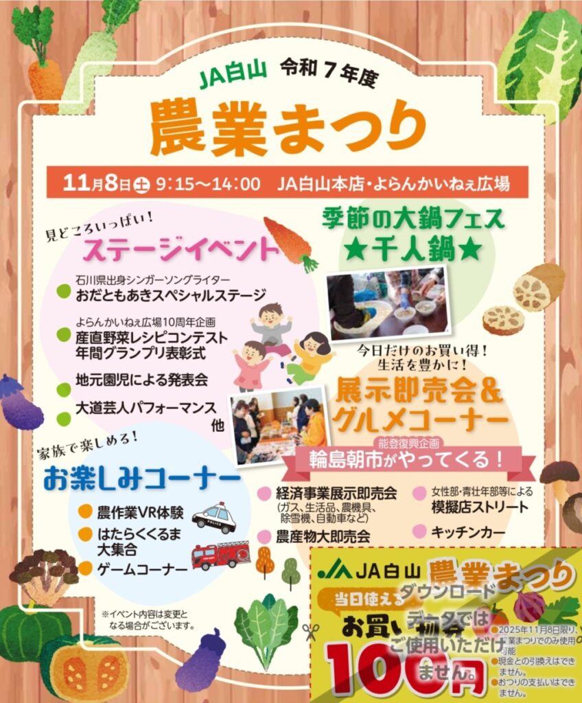 11月9日(土)、JA白山 本店・よらんかいねぇ広場で「JA白山農業まつり」が開催されます。