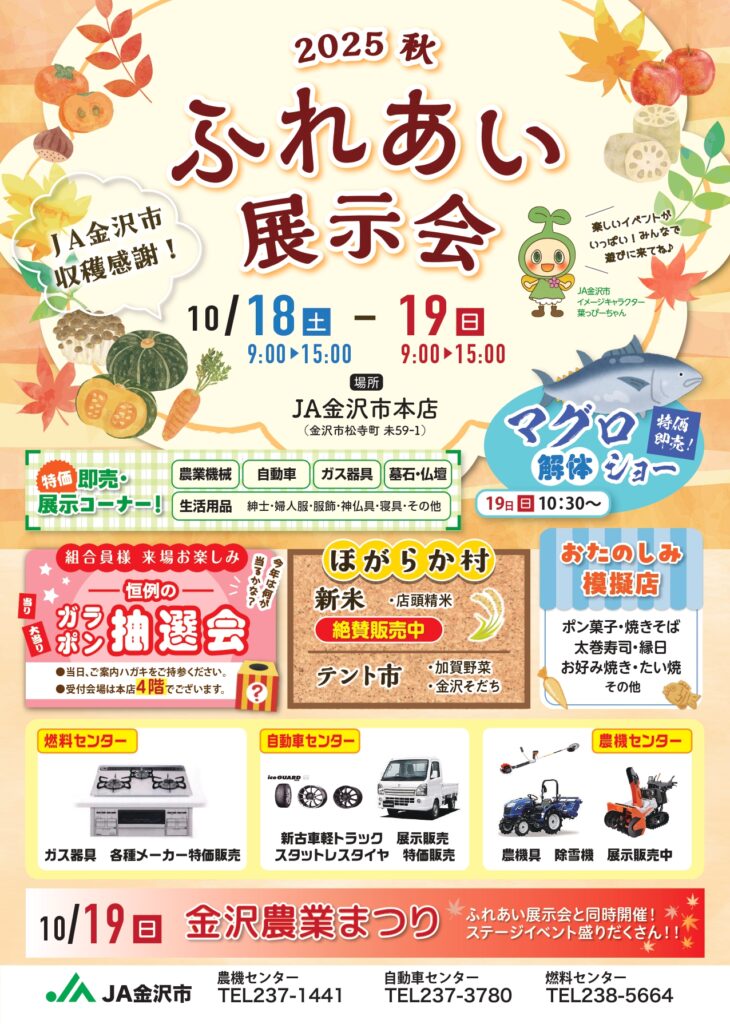 また、同じくJA金沢市本店では10/18(土)と19(日)にふれあい展示会も開催されます!