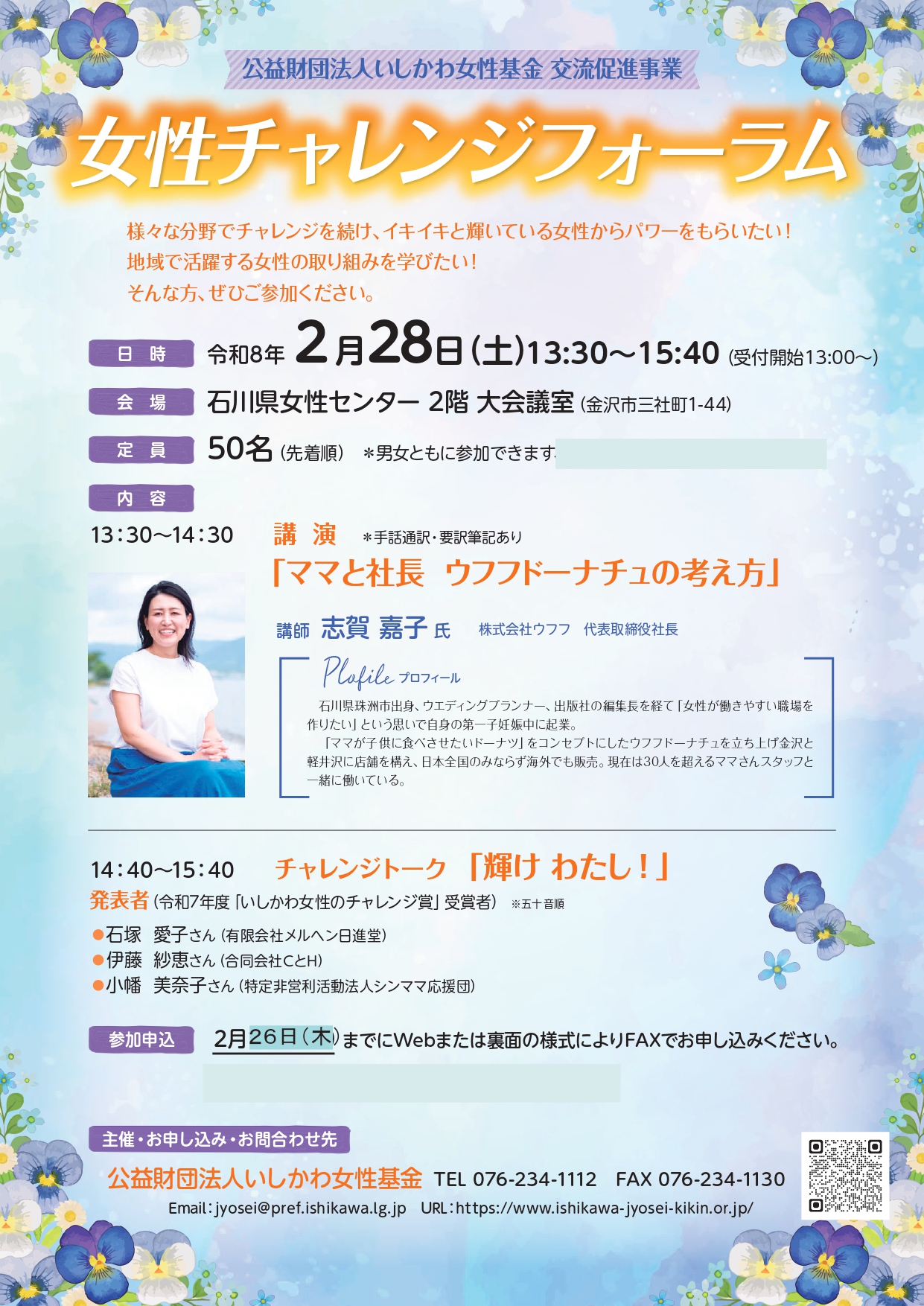 | 内容・特記事項 | 【参加費】 無料 【定員】 50名(先着順) *男女ともに参加できます *未就学児の託児あり(首が座っている4か月児~未就学児・要事前申し込み) 【申込方法】 専用フォームからお申し込みください。 申込締切:2月26日(木) 【内容】 ◆講演会 「ママと社長 ウフフドーナチュの考え方」 講師:志賀 嘉子さん(株式会社ウフフ 代表取締役社長) ◆取組発表 チャレンジトーク 「輝け わたし!」 発表者:令和7年度「いしかわ女性のチャレンジ賞」受賞者 R7「いしかわ女性のチャレンジ賞」受賞者 ・石塚 愛子さん(有限会社メルヘン日進堂) ・伊藤 紗恵さん(合同会社CとH) ・小幡 美奈子さん(特定非営利活動法人シンママ応援団) |