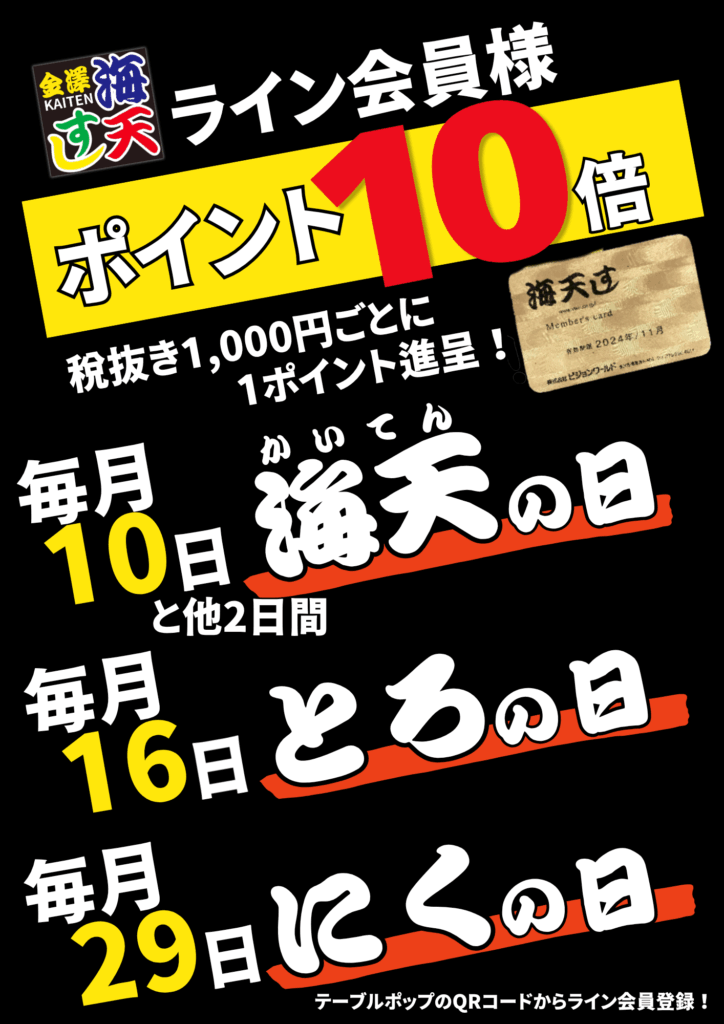 さらに、「とろの日」「にくの日」やお誕生日、毎月開催されるイベント日には、ポイントが通常の10倍になります。最新のイベント情報は公式LINEにて配信しています。