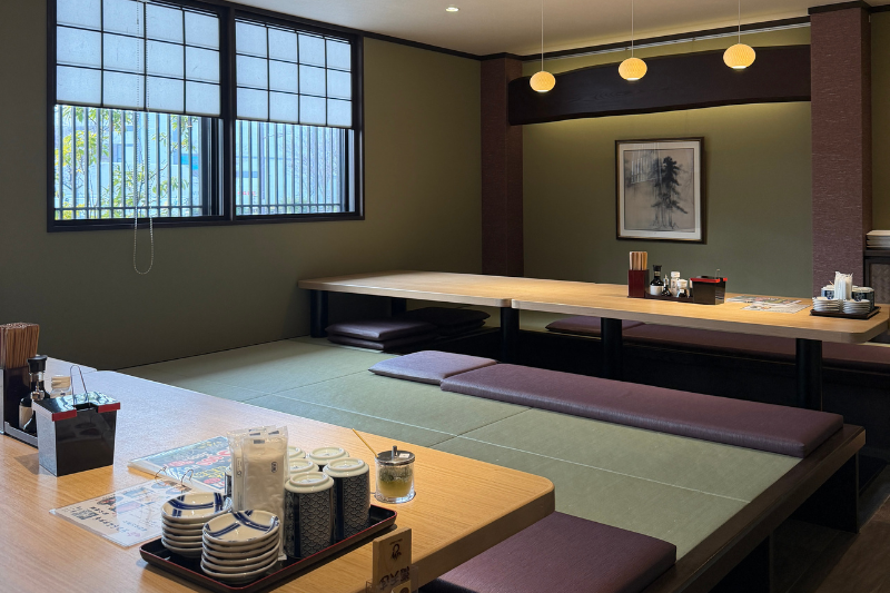 “お席まで”ではなく、お手元まで届けられるオートウェイターレーンを使用しています。(全国初) 窓際にある小上がり席は足をおろしてくつろげる掘りごたつ式になっています。