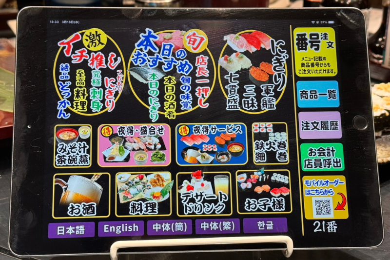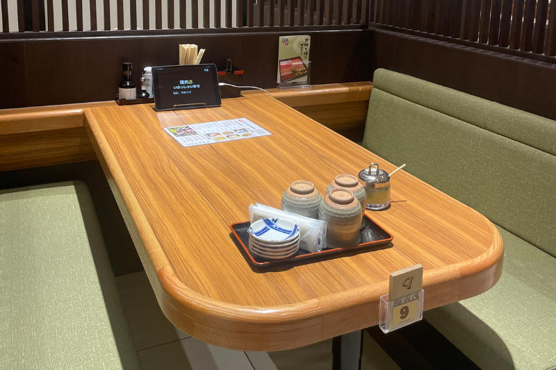 タッチパネルで注文を受けてから、握りたてのお寿司を手渡しで提供するスタイルへと進化しました。テーブル席は高い仕切りが設けられており、ゆったりと食事を楽しむことができます。