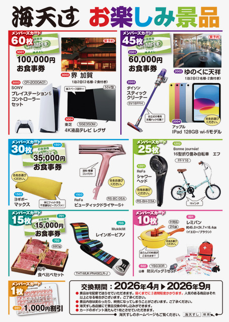海天すしでは、全店舗共通で使えるメンバーズカード(LINE会員)をご用意しております。税抜1,000円ごとに1ポイントが貯まり、カードの枚数に応じて老舗高級旅館の宿泊券や人気タブレットなどの豪華景品と交換できます。