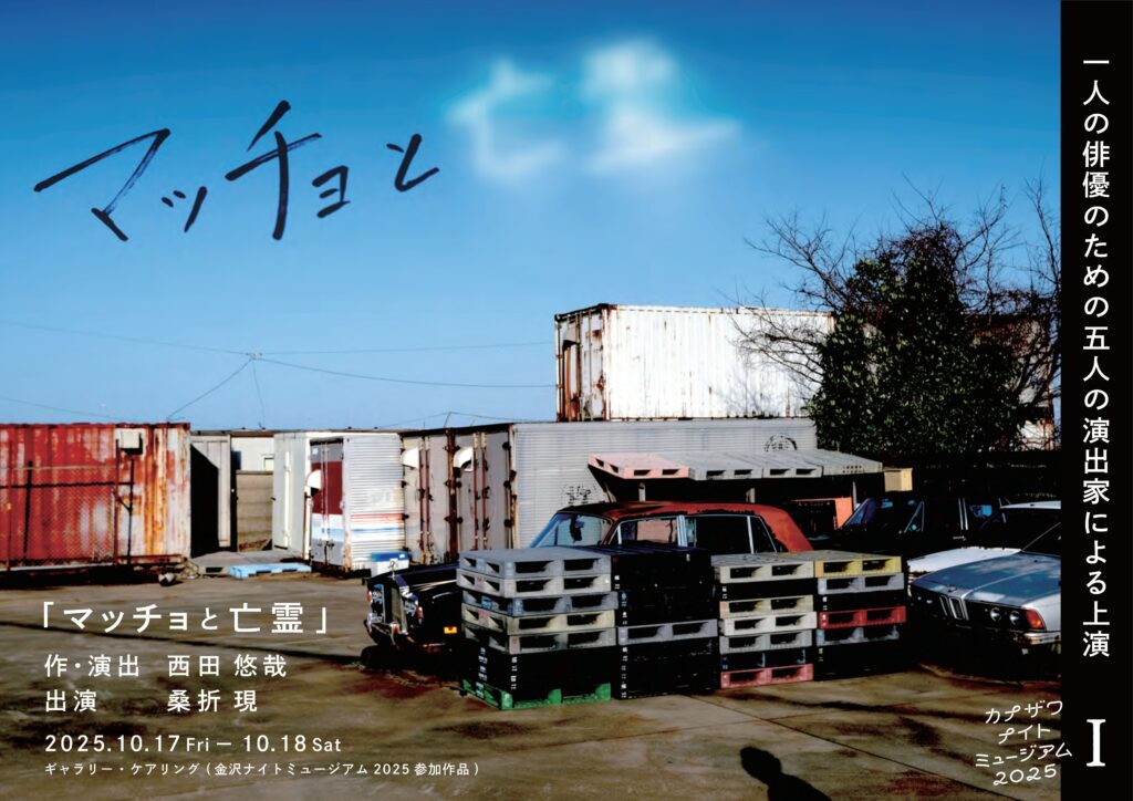 内容・特記事項 | 時間|10月17日(土)19:00、10月18日(土)14:00/18:00 料金|2,500円 定員|各回30名 予約受付 9/1 10:00am~受付開始 申込フォーム|こちら 【主催者さまより】 金沢ナイトミュージアム2025にて、俳優・桑折 現と、5人の演出家による演劇の金沢公演を開催します。 現代演劇の最前線を走る演出家と俳優による至高の一人芝居をご覧いただきます。全国4都市での上演し、好評を博した作品の金沢特別バージョンをお送りします! |