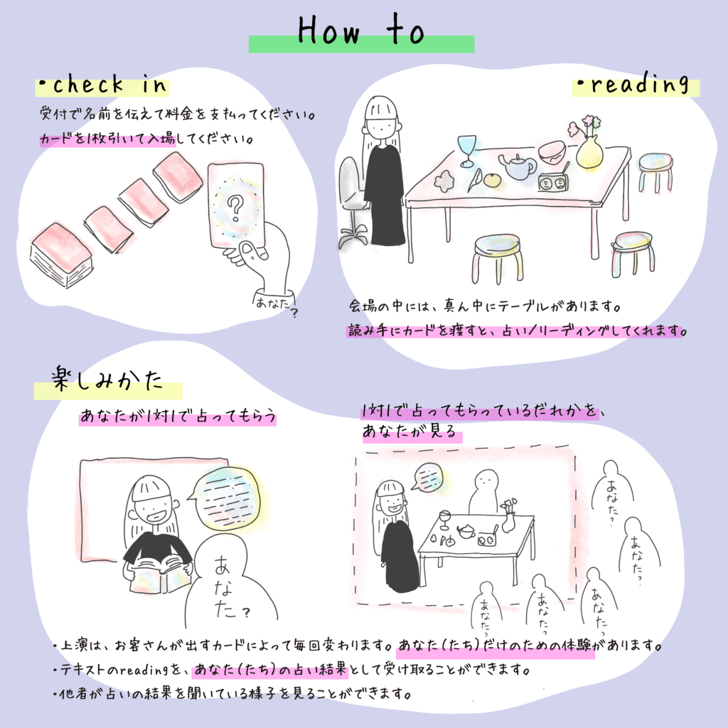 内容・特記事項 | ■10月3日(金) 石川県立図書館だんだん広場 *占い形式・当日先着順* 日 時|10月3日(金) 18:45~20:00(途中入退場可) 料 金|体験1回につき300円 定 員|なし。開催時間内、当日先着順 申 込|予約不要 ■10月4日(土) 金石町家(仮) *演劇上演形式・予約優先* 日 時|10月4日(土) 14:00~(上演時間60分、開場13:40) 会 場|金石町屋(仮)(金石西1丁目27-13) 料 金|子ども500円、大人1,500円 ※子どもは小学1年生~18才まで。未就学児は入場無料、予約時要連絡。 定 員|30名 申込先|こちら(8/23 9:00受付開始) ■10月5日(日) しいのき迎賓館 *演劇上演形式・予約優先* 日 時|10月5日(日)14:00~(上演時間60分、開場13:40) 会 場|石川県政記念しいのき迎賓館(広坂2丁目1-1) 料 金|1,500円 ※未就学児は入場無料、予約時要連絡。 定 員|30名 申込先|こちら(8/23 9:00受付開始) 【主催者さまより】 金沢ナイトミュージアム2025にて、東京を拠点に活動するcon-cen(コンセン)の演劇・占い公演「恋愛のあなたたち(断章)」を開催します。”恋愛のあれこれ”について、古今東西の文学を引用してロラン・バルトが書いた本『恋愛のディスクール・断章』にインスパイアされてつくったcon-cenの『恋愛のあなた(たち)・断章』は、お客さんに占いのカードを引いていただくことで上演が進んでいきます。 今回は、お一人ずつの占いを気軽に体験していただく「占いバージョン」(石川県立図書館)と、お一人ずつの占いに加えて、会場全体でつむがれる演劇の時間も楽しんでいただく「劇場バージョン」(金石町家(仮)、しいのき迎賓館)の2つの上演をつくって、みなさまのお越しをお待ちしております。 |