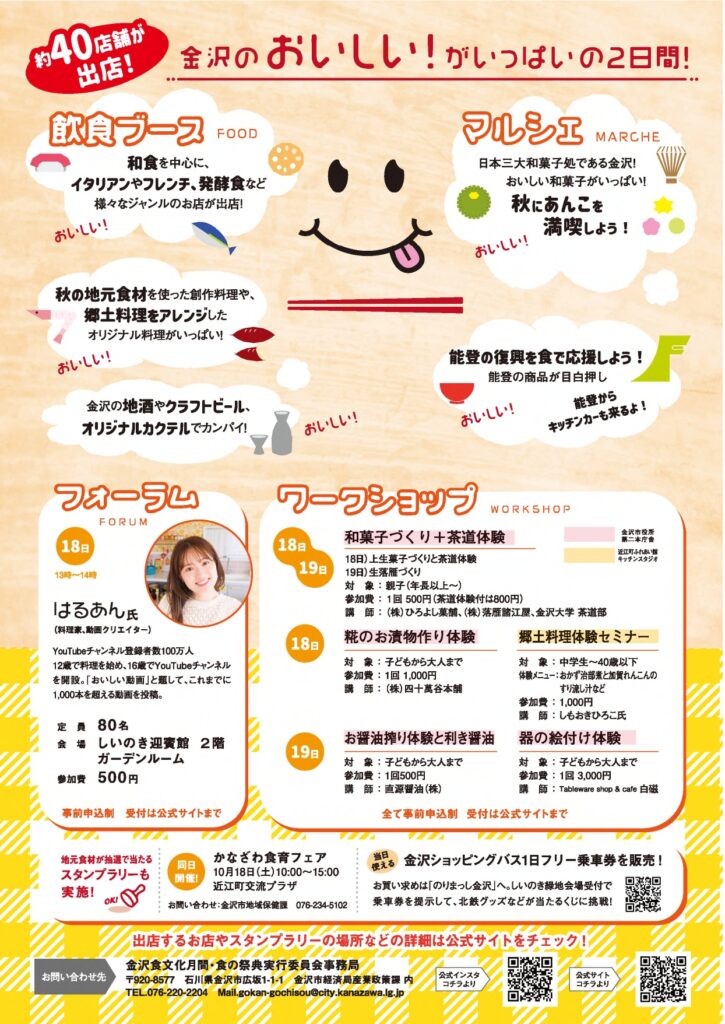 若い世代に人気の料理家による加賀野菜をテーマとしたフォーラムや、親子で参加できる茶道体験など、金沢の「おいしい」がいっぱいつまった2日間!ぜひ食欲の秋を満喫しに、気軽に足を運んでみてはいかがでしょうか?