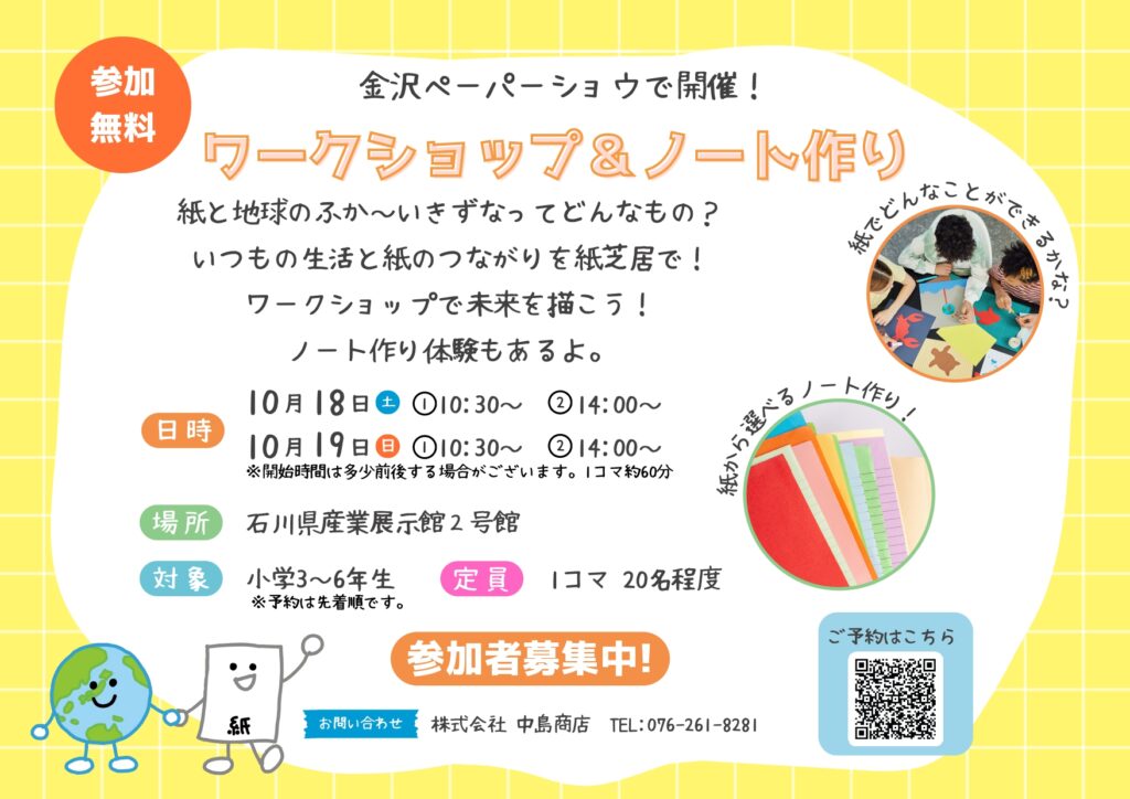 特記事項 | 現在、紙と地球のきずなが丸わかり⁉ワークショップ&ノート作りの参加者を募集中♩ 紙と地球のふか~いきずなってどんなもの? いつもの生活と紙のつながりを紙芝居で! ワークショップで未来を描こう! ノート作り体験もあります。 ➤開催日時 ・2025年10月18日(土) ①10:30~ ②14:00~ ・2025年10月19日(日) ①10:30~ ②14:00~ ➤対象 小学3~6年生 ※先着予約制です。 ➤申込み こちらのリンクからお申込みください。 |