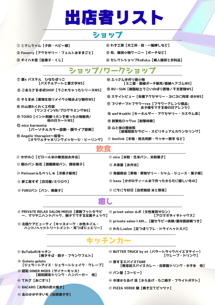 記念の10回目となる今回は、例年人気のワークショップやキッチンカーに加え、癒しのブースが拡大!占いからキッズメイク、ネイルまで9店舗が集結し、大人もゆったりと一日を過ごせる内容になっています。珠洲の蜂蜜が震災後初出店として登場する点にも注目です。