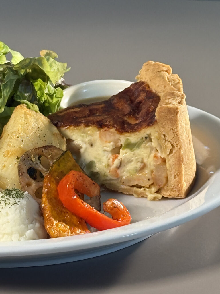 新感覚のシチューのようなトロトロなキッシュには、ホワイトソース・ブロッコリー・エビ・マッシュルーム・タマネギ・卵・チーズが含まれています。側面のホロホロ生地もたまりません。
